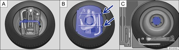 Fig. 161 In the luggage compartment underneath the floor covering A: Spare wheel and vehicle toolkit without ball coupling, B: Spare wheel and vehicle toolkit with ball coupling, C: Spare wheel and vehicle toolkit without ball coupling